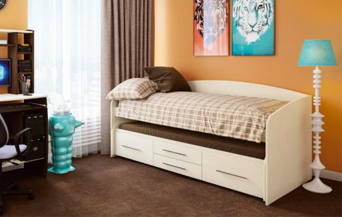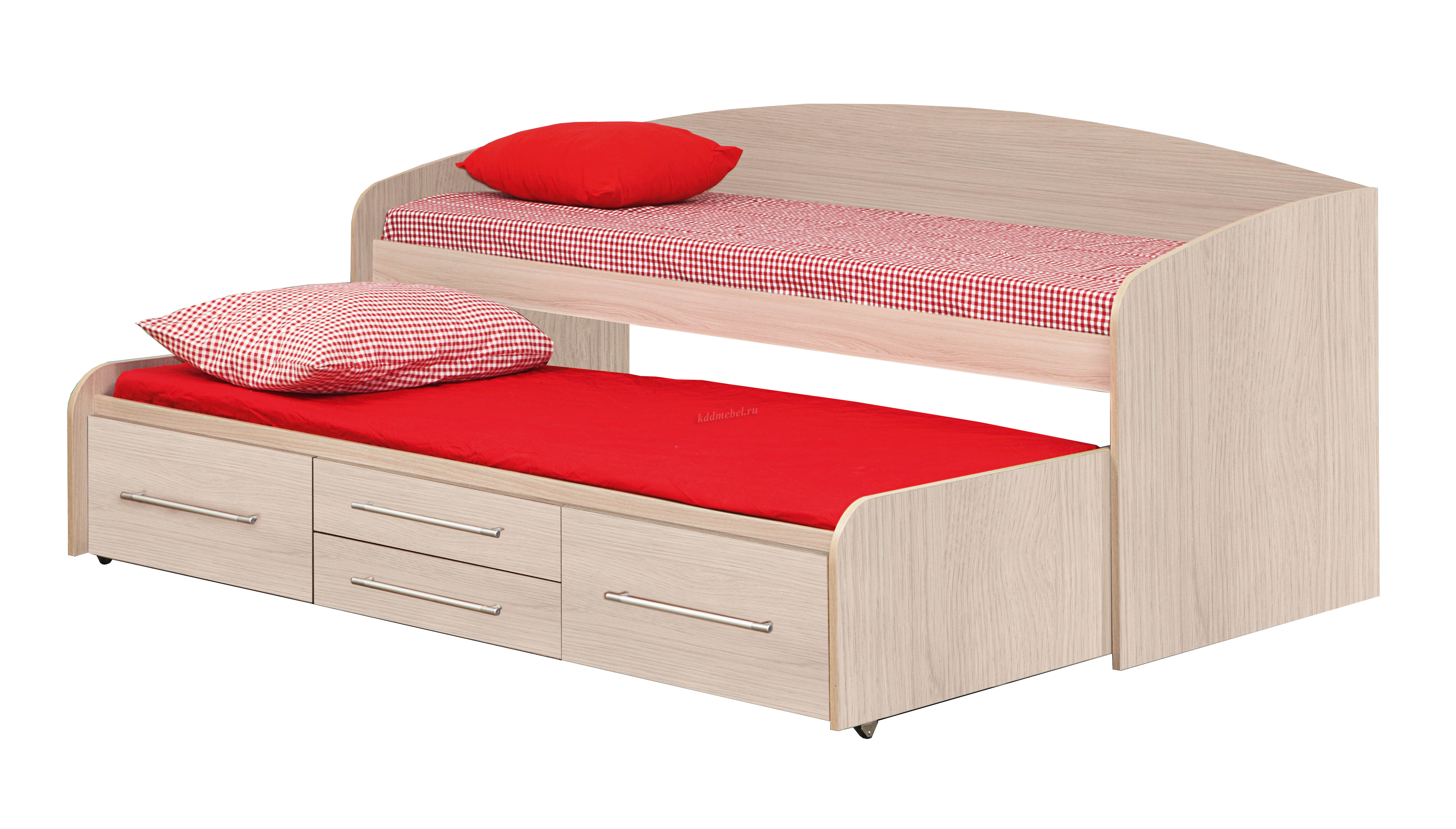 Двухъярусная детская кровать «Адель-5» имеет весьма необычную компоновку. У неё выдвижное нижнее спальное место, благодаря чему общая высота кровати составляет всего 66 см. Нижний блок оснащён двумя парами больших и малых выдвижных ящиков для постельных принадлежностей, а также колёсиками, поэтому для его выдвигания вам не потребуется значительных усилий. Размеры спальных мест отличаются. Кровать оборудована боковинами и задней спинкой.