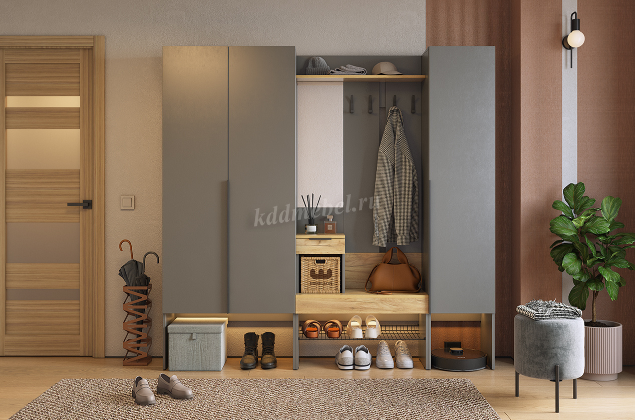 Шкаф оснащен накладными петлями с доводчиком от Боярд, которые обеспечивают плавное и бесшумное закрывание дверей. Наполнение в виде полок предоставляет удобный доступ к одежде, позволяя легко организовать внутреннее пространство.