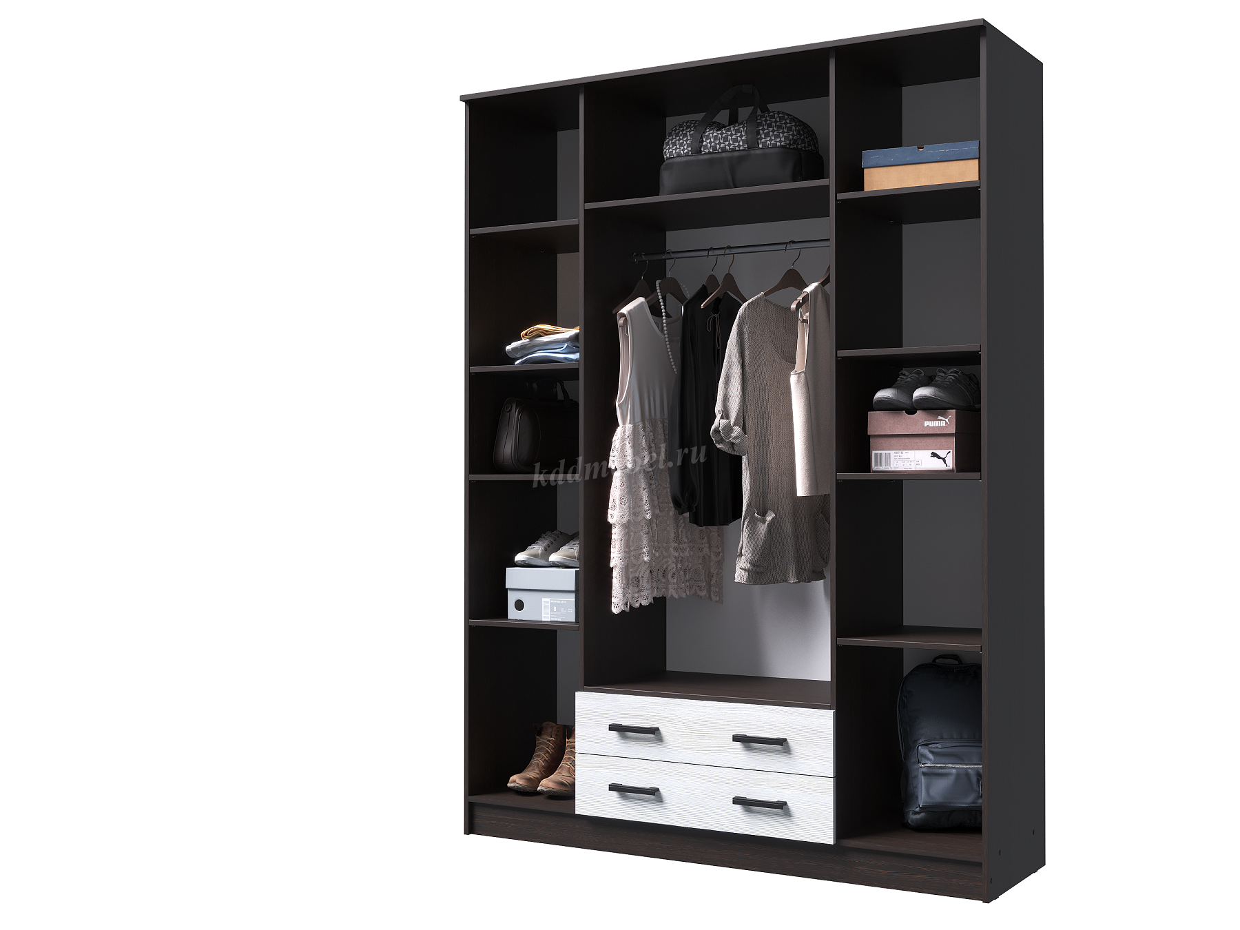 за центральными дверцами, помимо верхней полки, имеется штанга для одежды;