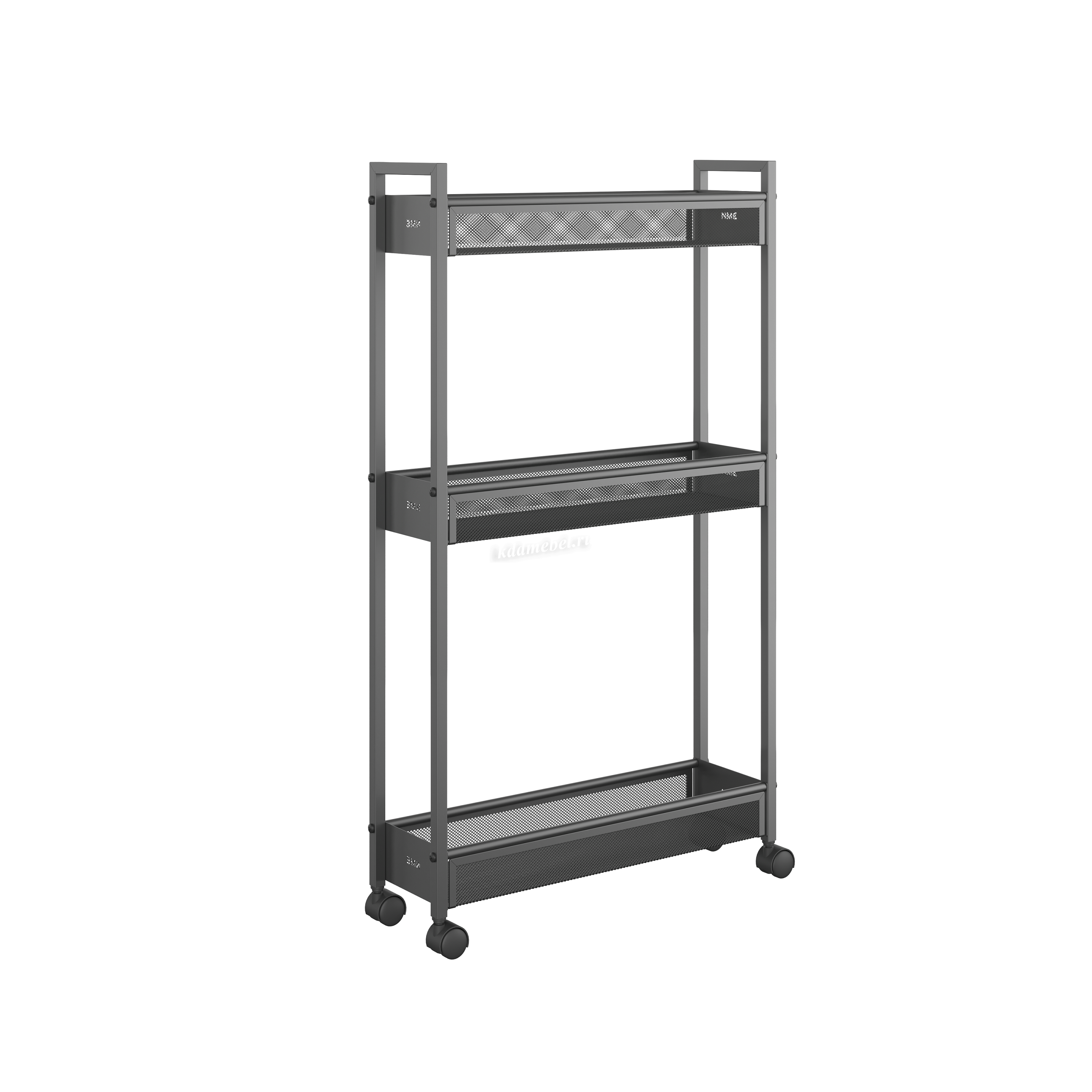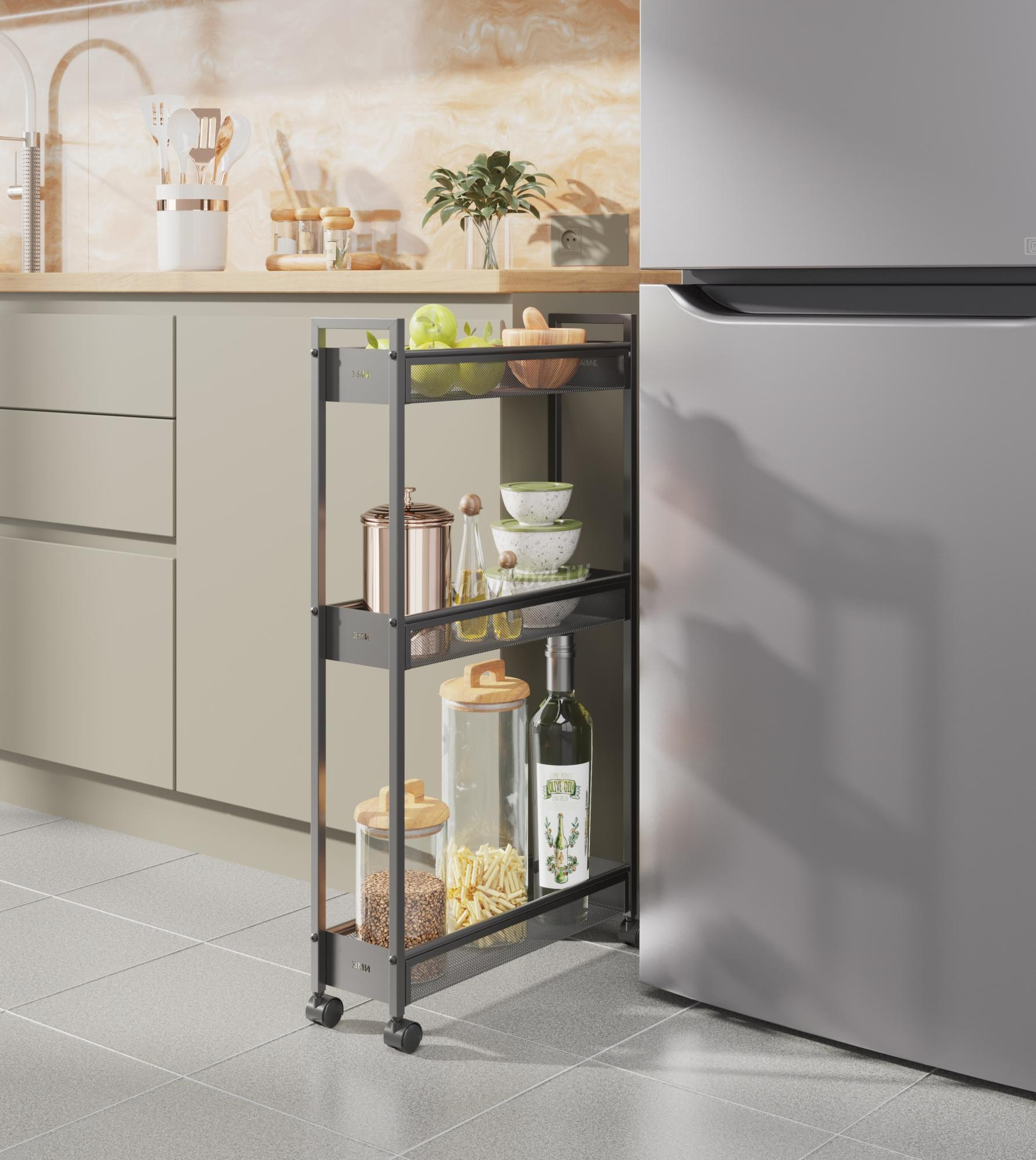 Эта лёгкая, но прочная этажерка с вместительными корзинами и мобильными колесиками (360°) легко перемещается и вписывается в любой интерьер.
